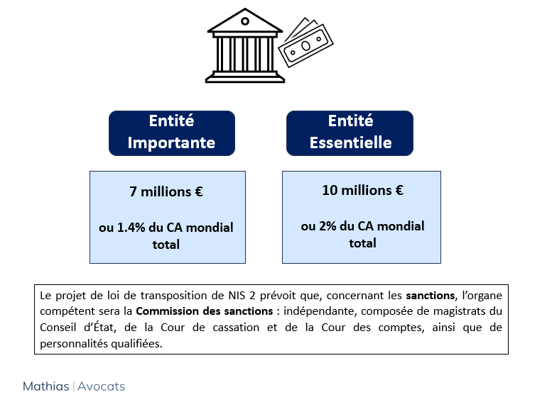 A cet égard, l’article 34 de la directive NIS 2 définit les conditions générales relatives aux amendes administratives imposées aux entités essentielles et importantes. Ainsi, les États membres de l’Union européennes devront-ils veiller à ce que les sanctions administratives prévues par le droit national soient effectives, proportionnées et dissuasives, compte tenu des circonstances de chaque cas.